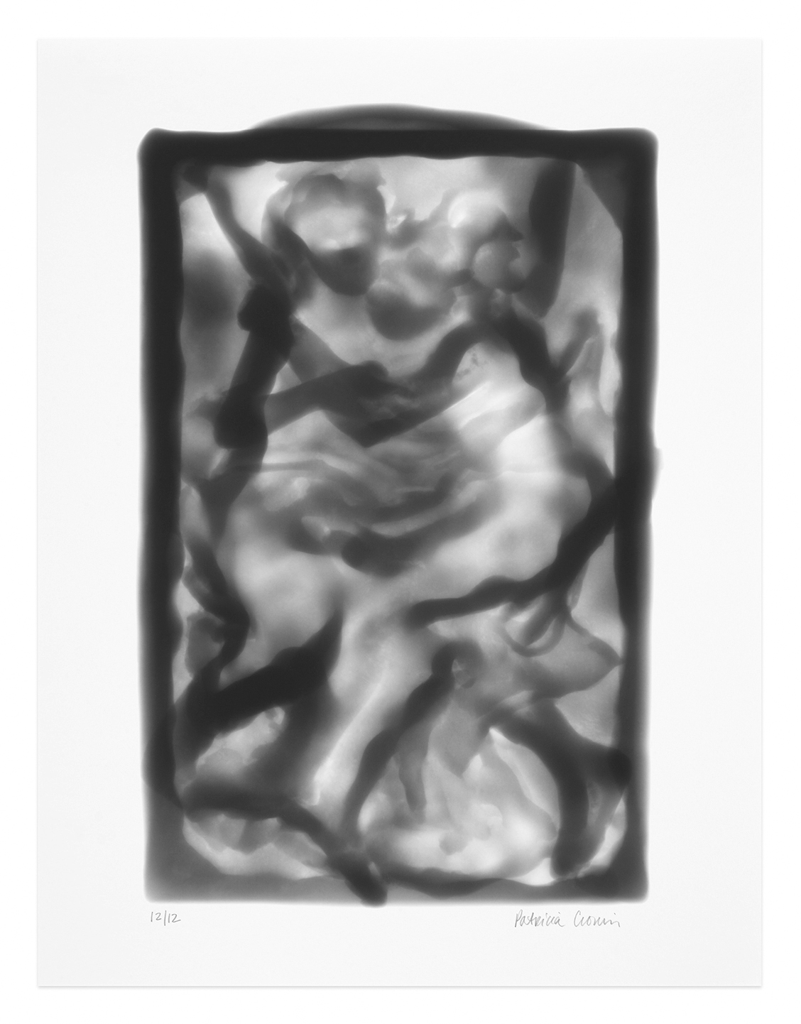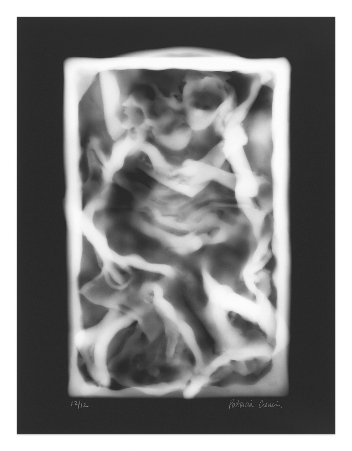 “Memorial To A Marriage” was begun in the twentieth-anniversary year of the artist’s groundbreaking marble sculpture of the same name in New York’s Woodlawn Cemetery in the Bronx (2002). It reconceives in the graphic arts the sculpture; paradoxically, although not occupying physical space, numerous new perspectives are revealed, as the two prints that compose the project give form to the invisible in ethereal and uncanny ways.